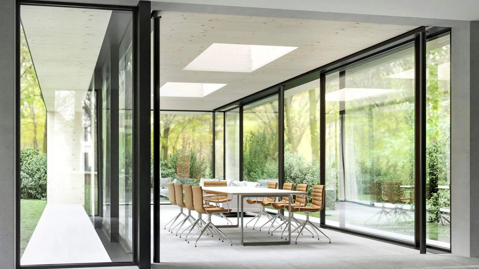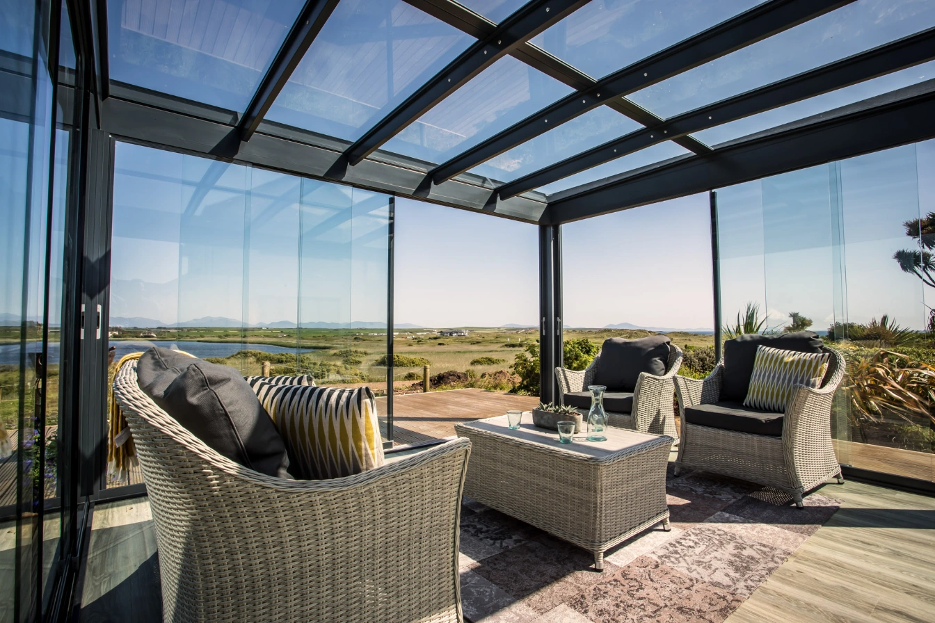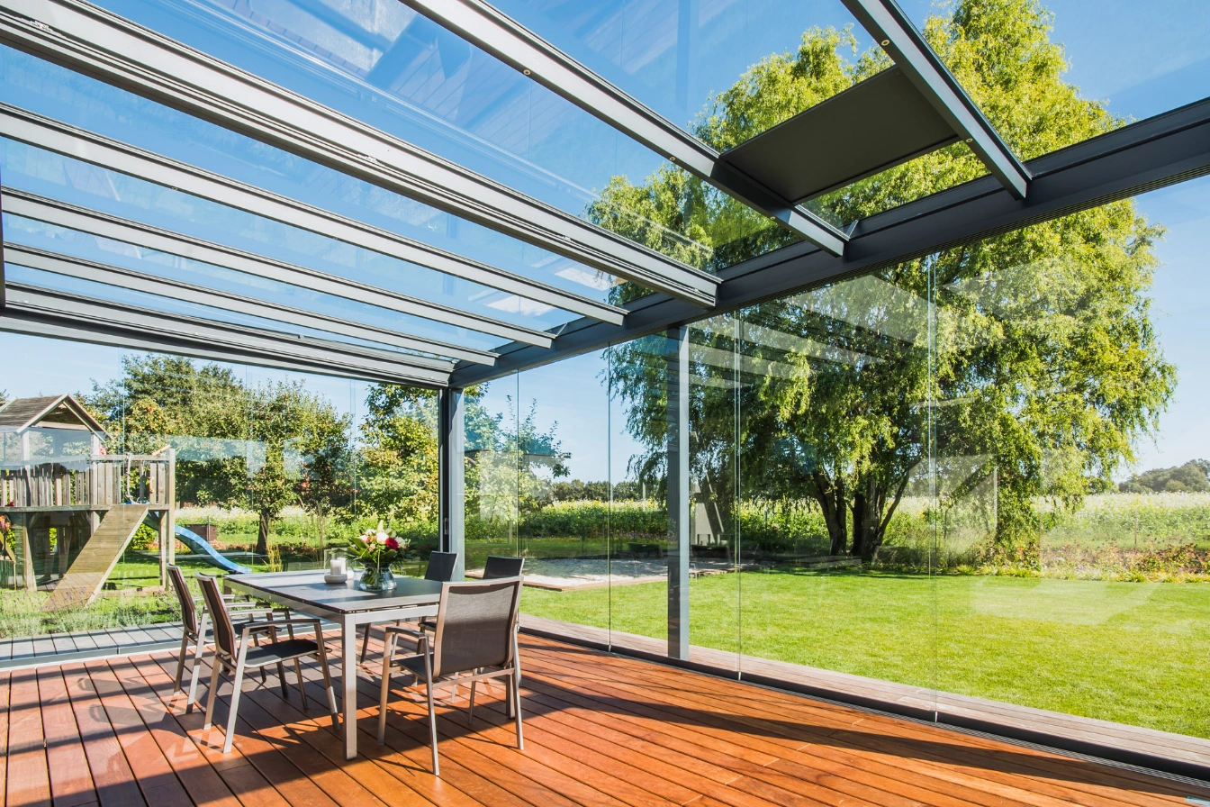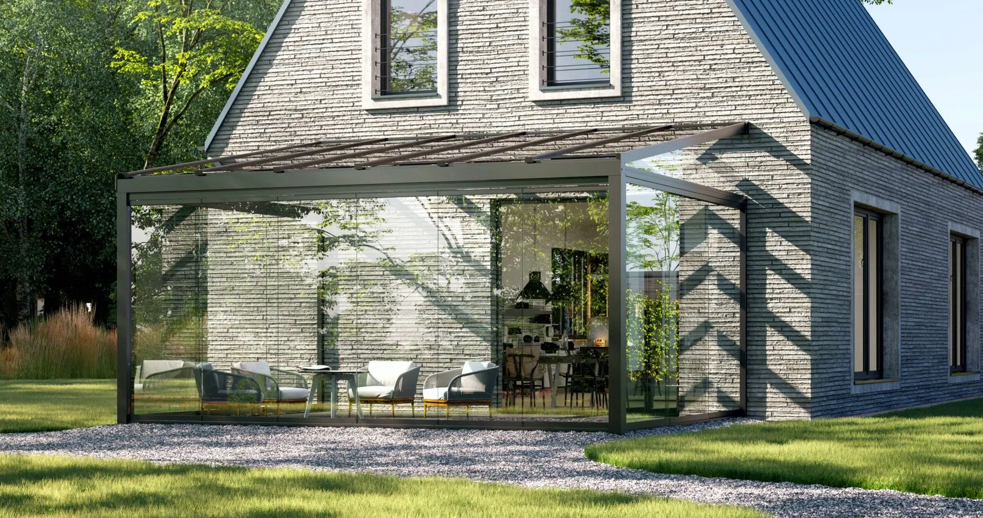 Une pergola minimaliste en aluminium noir associée à un vitrage panoramique transforme cette terrasse en espace lumineux et protégé. La structure s’intègre harmonieusement à l’architecture moderne de la maison pour créer un lieu de vie élégant.