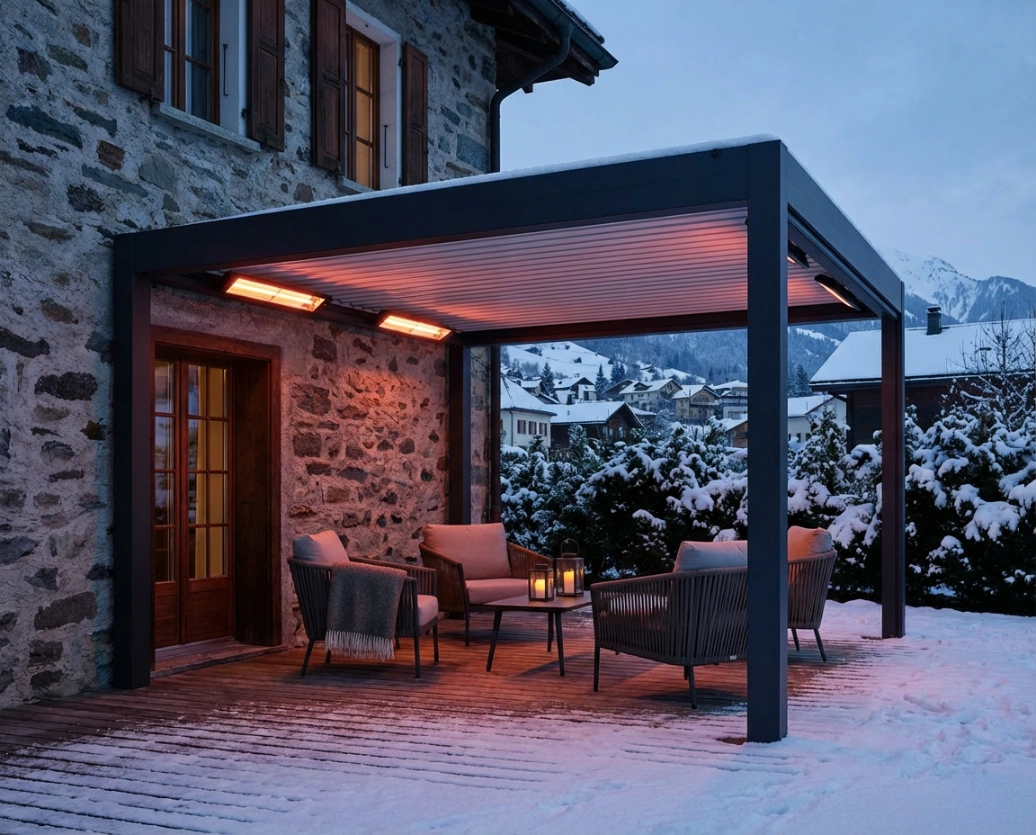 Des radiateurs infrarouges suspendus vous permettent d’utiliser votre pergola jusqu’en automne avancé. Prévoyez entre 1’000 et 2’000 CHF pour un système de chauffage adapté à votre surface. Ces radiateurs chauffent les personnes et les objets plutôt que l’air, ce qui les rend très efficaces en extérieur.