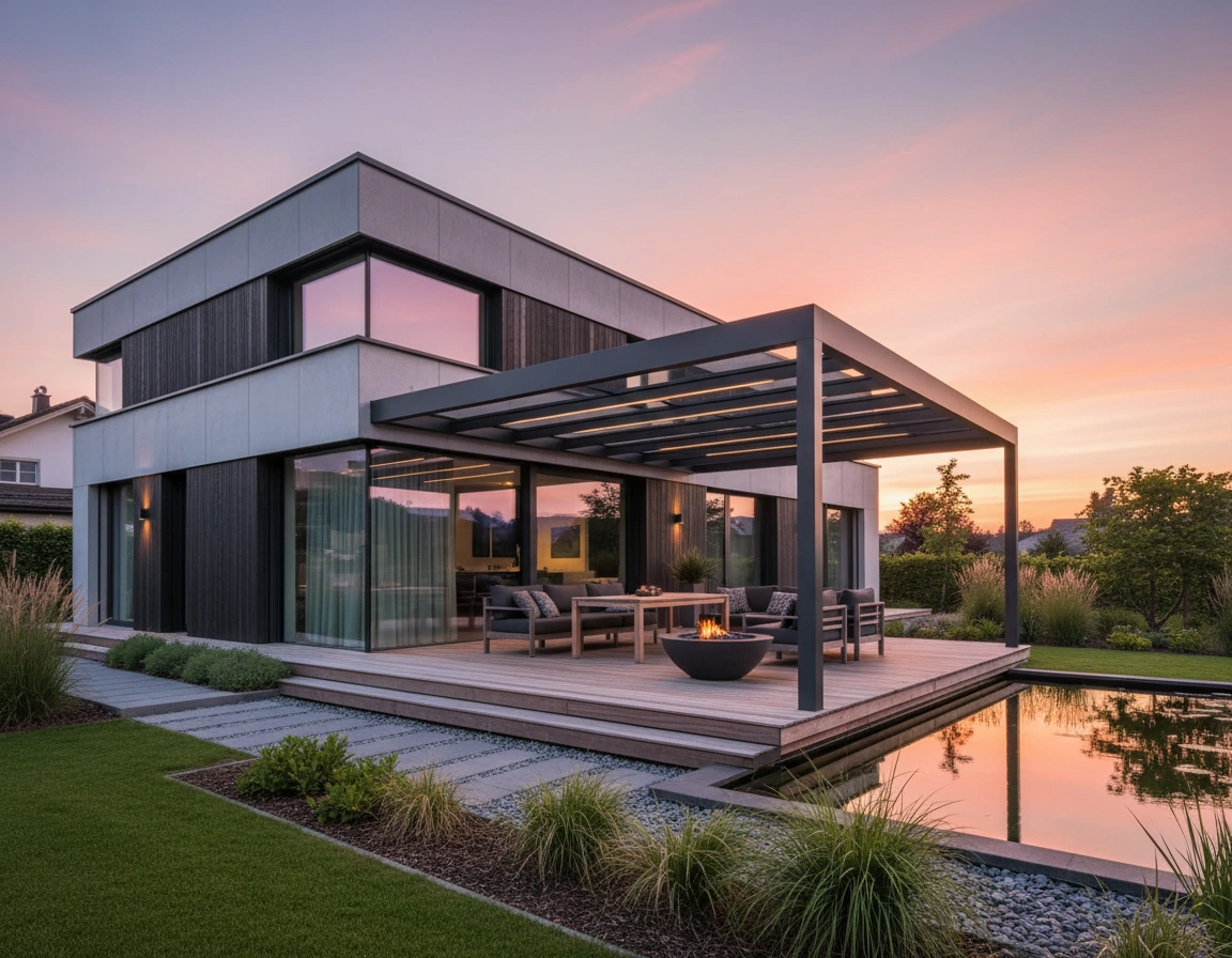 Une pergola minimaliste en aluminium noir associée à un vitrage panoramique transforme cette terrasse en espace lumineux et protégé. La structure s’intègre harmonieusement à l’architecture moderne de la maison pour créer un lieu de vie élégant.